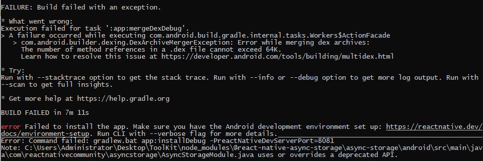 Error: Command failed: gradlew.bat app:installDebug -PreactNativeDevServerPort=8081